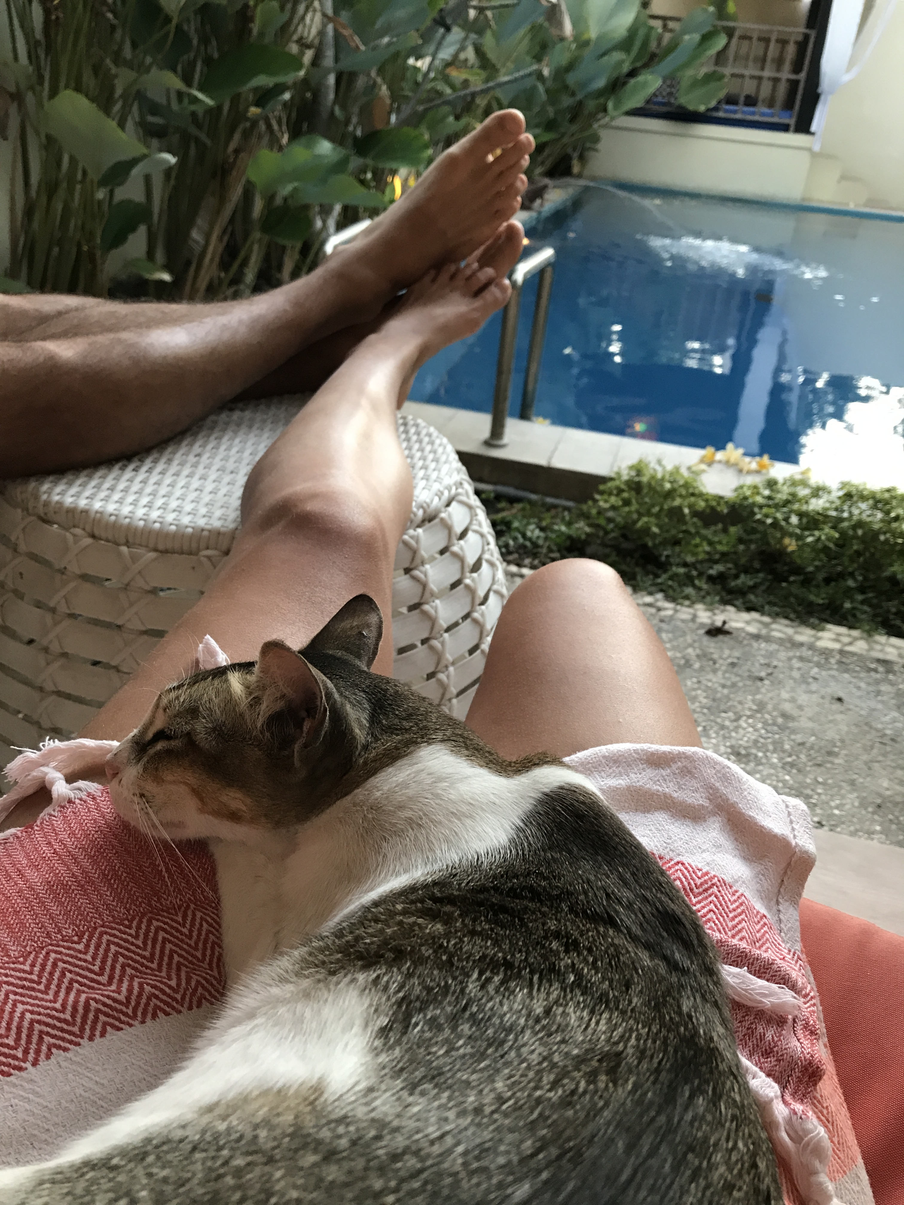 We werden in onze villa hartelijk ontvangen door de sympathieke Nederlandse Meggie, de eigenares van de prachtige villa’s tussen de rijstvelden. Het is absoluut een vrouw naar ons hart omdat ze ook katten adopteert die hier gewond aankomen. Deze lapt ze terug op en vervolgens willen ze hier niet meer weg. Er zijn intussen al 18 poezen die hier hun gouden mandje gevonden hebben!